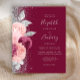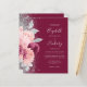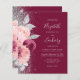 The left-hand edge of this elegant modern wedding invitation features a floral bouquet in shades of burgundy and blush pink, trimmed with silver faux foil and faux glitter foliage and sprinkled with silver faux glitter. The customizable text combines silver gray handwriting script, copperplate and italic fonts on a burgundy background. The reverse side features a matching burgundy, blush and silver floral design.