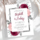 This design features lush bouquets of burgundy red, blush pink and silver flowers adorning a silver faux foil rectangular frame. Customize the text on a white background with the first names of the bride and groom in modern burgundy handwriting script, with the date, time and wedding venue in charcoal gray sans serif font. The back of the card is a matching shade of solid burgundy.