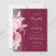 The left-hand edge of this elegant modern wedding invitation features a floral bouquet in shades of burgundy and blush pink, trimmed with silver faux foil and faux glitter foliage and sprinkled with silver faux glitter. The customizable text combines silver gray handwriting script, copperplate and italic fonts on a burgundy background. The reverse side provides space for wedding details on a solid burgundy background, along with a QR code guests can scan to visit your website and RSVP.