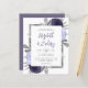 This design features lush bouquets of dusty purple and silver flowers adorning a silver faux foil rectangular frame. Customize the text on a white background with the first names of the bride and groom in modern dusty purple handwriting script, with the date, time and wedding venue in charcoal gray sans serif font. The back of the card is a matching shade of solid dusty purple.
