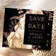 This elegant, moody wedding Save the Date card features a lush, romantic floral bouquet in ivory with rose gold faux foil and glitter foliage on a black background. Customize the rose-colored text in stylish fonts on a black rectangle, and add your wedding website URL to the solid black back.