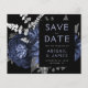 This elegant, moody wedding Save the Date card features a lush, romantic floral bouquet in navy blue with silver faux foil and glitter foliage on a black background. Customize the silver gray and dusty blue text in stylish fonts on a black rectangle, and add your wedding website URL to the solid black back.