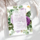 An elegant watercolor bouquet of purple roses surrounded by green eucalyptus leaves and gold foliage provides the background for the charcoal gray text on a white rectangular screen.
