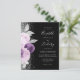 The left-hand edge of this elegant modern wedding invitation features a floral bouquet in shades of purple and lavender, trimmed with silver faux foil and faux glitter foliage and sprinkled with silver faux glitter. The customizable text combines pale silver gray handwriting script, copperplate and italic fonts on a black background. Add additional details on the back, along with a QR code to help your guests visit your wedding website.