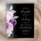 The left-hand edge of this elegant modern wedding invitation features a floral bouquet in shades of purple and lavender, trimmed with silver faux foil and faux glitter foliage and sprinkled with silver faux glitter. The customizable text combines pale silver gray handwriting script, copperplate and italic fonts on a black background. The reverse side features a matching floral design.