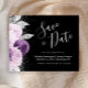 This elegant budget save the date card features a floral bouquet in shades of purple and lavender, trimmed with silver faux foil and faux glitter foliage and sprinkled with silver faux glitter. The customizable text combines pale silver gray handwriting script, copperplate and italic fonts on a black background. The reverse side features a matching floral design.