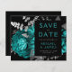 This elegant, moody wedding Save the Date card features a lush, romantic floral bouquet in teal blue with silver faux foil and glitter foliage on a black background. Customize the silver gray and teal text in stylish fonts on a black rectangle. Add additional details on the back, and enter your wedding website URL to generate a QR code.