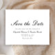 This stylish formal wedding save the date card features elegant black script and small capital fonts on a white background. The reverse is solid black.