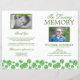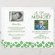Irish budget funeral program featuring a traditional white background, green watercolor clovers, a photo of your lost loved one, the funeral details, an obituary, order of service, the details of the wake, another photo on the back page, and a personalized thank you note. PLEASE NOTE: These come as a flat piece of quality paper, you will need to fold them yourself.
