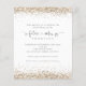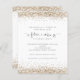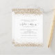 Future Mrs Gold Glitter Bridal Shower invitation. A budget price SMALLER 4.5” x 5.6” alternative. Available in a SEMI GLOSS 110 lb CARD STOCK which is the default option (recommended for invitations), OR a SATIN FINISH 80 lb THINNER PAPER STOCK (ideal for enclosures). Envelopes are an optional extra and are slightly larger than the card size. The Future Mrs is in an artsy set script with ring and heart motifs and the rest of the text you can easily personalise. The top and bottom edges on both sides are bordered with gold faux glitter.
