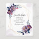 Featuring purple and dark blue floral with a gold foil geometric frame and script typography