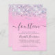 Budget-friendly girly 14th birthday party invitation with sparkly holographic purple, pink and silver faux glitter confetti against a pink background and "fourteen" in a soft grey trendy script with swashes.