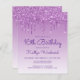 This trendy 16th birthday party invitation features a sparkly purple faux glitter drip border and purple ombre background. The words "16th Birthday" and the name of the guest of honor appear in casual purple handwriting script, with the rest of the customizable text in sans serif font. The same purple glitter drip design appears on the reverse side.