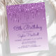 This trendy 18th birthday party invitation features a sparkly purple faux glitter drip border and purple ombre background. The words "18th Birthday" and the name of the guest of honor appear in casual purple handwriting script, with the rest of the customizable text in sans serif font. The same purple glitter drip design appears on the reverse side.