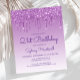 This trendy 21st birthday party invitation features a sparkly purple faux glitter drip border and purple ombre background. The words "18th Birthday" and the name of the guest of honor appear in casual purple handwriting script, with the rest of the customizable text in sans serif font. The same purple glitter drip design appears on the reverse side.