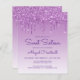 This trendy Sweet Sixteen birthday party invitation features a sparkly purple faux glitter drip border and purple ombre background. The words "Sweet Sixteen" and the name of the guest of honor appear in casual purple handwriting script, with the rest of the customizable text in sans serif font. The same purple glitter drip design appears on the reverse side.