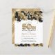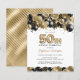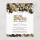 This budget 50th birthday invitation features sparkling glitter balloons in various shades of gold and black with gold balloon number 50th. Falling streamers and confetti in black and gold complete the party vibe. Back features gold diagonal stripes. Easy to customize by clicking "Personalize".