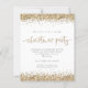 Gold Glitter Script Christmas Party Invite. A budget price SMALLER 4.5” x 5.6” alternative. Available in a SEMI-GLOSS 110 lb CARD STOCK which is the default option (thicker for invitations), OR a SATIN FINISH 80 lb THINNER PAPER STOCK (ideal for enclosures). Envelopes are an optional extra and are slightly larger than the card size. Glam style for your Holiday party with gold faux glitter bordering the top and bottom edges on both sides and in a set handwriting style script for the occasion typography. Easily personalise the text to your own details.