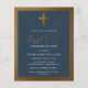 Elegant first holy communion invitations featuring a faux gold cross, border, and script on a navy blue background. As part of the budget selection here on Zazzle, these invitations do not come with envelopes nor do they fit snugly in a standard-sized envelope. The closest size is A6 but there will be a gap of approximately half an inch. If you don't mind the lack of snugness you could use such widely available A6 envelopes. Otherwise, this design can be transferred to a standard 5x7 format (which comes with envelopes) using the design transfer tool. As a rough guide, as of the time of writing, 100 budget invitations (including a volume discount) would cost around $39 whereas 100 standard 5x7 invites including envelopes would cost approximately $135. Your mileage may vary depending on Zazzle's available promo codes, site-wide sales, or changes in pricing.