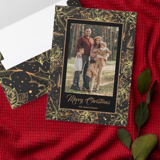 Affordable 5.5" x 8.5" Christmas party flyers feature gold poinsettias, holly leaves and berries on a black background and your party information in chic gold lettering, perfect for any holiday event. Printed on value 80 lb paper available in 3 sizes. **NO ENVELOPES INCLUDED. Be sure to double-check your order before adding it to your cart as what you see on the screen is what will be printed. The Live Design Service can help you with your design layout if needed.