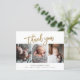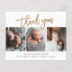 This Budget Gold Script 3 Photo Baby Thank You Card features gold handwritten calligraphy thank you and birth details on the front. The back includes a personal message from the entire family. Click the edit button to customize this design with your photos and details.