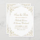 This elegant vintage-inspired formal wedding save the date card features the text in gold colored script and serif fonts, framed by a delicate vintage gold vine motif. The frame is repeated on the reverse.