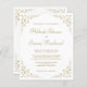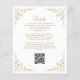 This elegant vintage-inspired formal wedding invitation features the text in gold colored script and serif fonts, framed by a delicate vintage gold vine motif. The frame is repeated on the reverse. The reverse side provides space for wedding details, along with a QR code guests can scan to visit your website and RSVP, which saves the cost of printing and mailing separate RSVP cards.