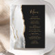 The left-hand edge of this elegant modern wedding menu features a gray and white watercolor agate border trimmed with faux gold glitter. The customizable text combines whimsical gold-colored handwriting script and copperplate fonts on a dark background. The reverse side features a matching gray and gold agate design.