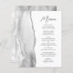 The left-hand edge of this elegant modern wedding menu features a gray watercolor agate design trimmed with faux silver glitter. The customizable text combines charcoal gray handwriting script and sans serif fonts on a white background. The gray and silver agate design is repeated on the reverse side.