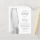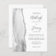 Save the cost of printing and mailing separate RSVP cards with this elegant modern all-in-one budget wedding invitation. The left-hand edge features a gray and white watercolor agate border trimmed with silver faux glitter. The customizable text combines charcoal gray handwriting, copperplate and italic fonts on a white background. The reverse side provides space for wedding details, along with a QR code guests can scan to visit your website and RSVP.