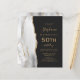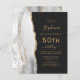 The left-hand edge of this elegant modern 50th birthday party invitation features a gray and white watercolor agate border trimmed with gold faux glitter. The customizable text combines gold-colored handwriting, copperplate and italic fonts on a slate black background. The reverse side features a matching agate design.