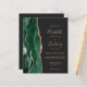 The left-hand edge of this elegant modern wedding invitation features an emerald green watercolor agate border trimmed with faux rose gold glitter. The customizable text combines rose pink handwriting, copperplate and italic fonts on a slate black background. The reverse side provides space for wedding details, along with a QR code guests can scan to visit your website and RSVP, which saves the cost of printing and mailing separate RSVP cards.