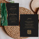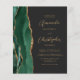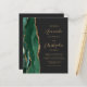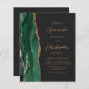 The left-hand edge of this elegant modern wedding invitation features an emerald green watercolor agate border trimmed with faux gold glitter. The customizable text combines gold-colored script and sans serif fonts on a slate black background. The reverse side provides space for wedding details on a solid slate black background, along with a QR code guests can scan to visit your website and RSVP, which saves the cost of printing and mailing separate RSVP cards.