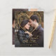 When you don’t have a wedding date set, but can’t wait to tell your family and friends that you’re engaged, you can add your own photos and text to this modern elegant engagement announcement budget card, to let them know the good news, along with the date and place where you got engaged. There is a gold double heart overlay on the photo, as well as trendy gold script text: “Two Hearts, One Love.” The back of the card features a second photo.