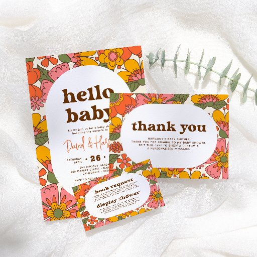 Budget baby shower invitations featuring midcentury modern arches, retro flower power patterns, and groovy type. The front of this card features a floral pattern background with a white oval overlay in the center. The warm vintage color palette of brown, yellow, orange, cream, and green hues gives a real 70s touch. The flowery daisy pattern is a hand-drawn cartoon-style pattern with bold colors and strong outlines to match the seventies hippie style. Inside the oval frame, there is the event information in a chic, simple layout. The text starts with "hello baby" in groovy typography with the parents' names written in a casual orange script handwriting font. Retro-inspired shapes and patterns with a modern twist! We have chosen to show two names for a couple's shower, but you can change this depending on your preference. Add your custom wording to these cards by clicking on "Personalize this template" and changing the text in the boxes. For more advanced customizations, scroll to "Click to customize further" and access Zazzle's Design Tool to edit fonts, change sizes, arrange placement, or add any additional information or image to these invites! Perfect for spring baby showers or summer baby showers. As part of the budget selection on Zazzle, this sheet isn't a standard invite size or paper quality. If you want this design on an invitation card you can find it in our store or use the Zazzle Make Machine to transfer it onto the product of your choice. Please note we only recommend the semi-gloss finish for the budget paper option, the satin finish is not suitable for use as an invitation. Please note the cards will be printed as you see them on your screen when ordering, and I can't modify an existing order, so be sure to double-check for typos! View the collection link on this page for matching stationery or browse my store for more budget-friendly baby shower invitations! Feel free to message me with any questions.