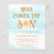 It features the text "Here Comes The Son" in stylish brown typography with a cute yellow watercolor sun and a blue sky background.