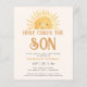 Invite family and friends to your sun-themed baby shower with this budget boys' baby shower invitation. It features the text "Here Comes The Son" in stylish typography with a cute yellow watercolor sun on a soft cream background. The back is decorated with a smiling sun pattern. Easily customizable. Original Watercolor © Michele Davies.