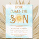 It features the text "Here Comes The Son" in stylish typography with a cute smiling sun on a blue watercolor sky background.