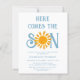Invite family and friends to your baby shower with this sun-themed boys' baby shower budget invitation. It features the text "Here Comes The Son" in blue typography with a bright yellow watercolor sun. The back is decorated with a sun pattern. Easily customizable. Original Watercolor © Michele Davies.