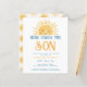 Invite family and friends to your sun-themed baby shower with this budget boys' baby shower invitation. It features the text "Here Comes The Son" in stylish blue typography with a cute yellow watercolor sun. The back is decorated with a smiling sun pattern. Easily customizable. Original Watercolor © Michele Davies.