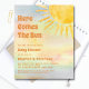This budget baby shower invitation is decorated with a hand-painted sun and "Here Comes The Sun" in stylish retro typography on a colorful watercolor background.
