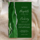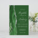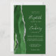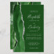 The left-hand edge of this elegant modern wedding invitation features a hunter green watercolor agate border trimmed with faux silver glitter. The customizable text combines silver gray handwriting, copperplate and italic fonts on a green background. The reverse side features a matching hunter green and silver agate design.