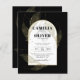 Introducing a softly formal black tie wedding item with black and gold colors adorned with delicate gold skeleton leaves overlaying the borders of an arched frame. This design is part of a coordinating collection and includes items such as RSVP cards, save the dates, invitations, welcome signs, stickers, napkins, programs, table number cards, favor bags, menus, and wine bottle labels, as well as a variety of card and paper types to fit any budget.