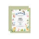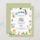 Cute jungle safari animals themed birthday invitation featuring tropical animals, an exotic bird, and other cute party elements. Send out the invites and celebrate the first birthday of the wild one with friends and family.
