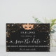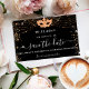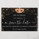 A girly and trendy Save the Date card for a 50th (or any age) birthday masquerade party. A classic black background decorated with faux gold glitter dust and a masquerade mask. Personalize and add a date and name/age. The text: Save the Date is written with a large trendy hand lettered style script.