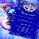 For an elegant Masquerade, Sweet 16, 16th birthday. A royal blue background. Decorated with faux silver glitter dust and a masquerade mask. Personalize and add a name, age and party details. The name is written with a hand lettered style script