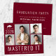 Budget-friendly burgundy red masters degree graduation announcement and party invitation featuring a 4 photo collage, "Mastered It" written in large white letters and his or her class year, name and college or university in simple white typography. On the back, add the graduation party details.