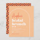 Budget bridal shower invitations. A modern, minimalist take on a retro theme! These budget-friendly bridal shower invitations have vintage colors, simple geometric shapes, and groovy type. The front of these sheets features a soft orange color. There is a white arch border framing the text. The event details are aligned to the bottom left-hand side with the bride's name in bright orange handwriting and "bridal brunch" in groovy typography. Some design choices in the layout of the text include the date in bold retro numbers, the venue in a larger size than the rest of the text, "rsvp" in a boho script font, and the registry information in the same bold orange color as the name. The cards reverse to a vintage 70s geometric pattern in a brown and orange color scheme. A fun design, perfect for spring or summer celebrations. As part of the budget selection on Zazzle, this sheet isn't a standard invite size or paper quality. If you want this design on an invitation card you can find it in our store or use the Zazzle Make Machine to transfer it onto the product of your choice. Please note we only recommend the semi-gloss finish for the budget paper option, the satin finish is not suitable for use as an invitation. The template text is editable online, simply click on "Personalize this template" to get started. For other edits, select "click to customize further" to access Zazzle's Design Tool. Please note the cards are printed as you see them on your screen when ordering, so be sure to double-check for typos! Other versions of this design are available in the collection linked on this page. Browse my store for more brunch bridal shower invitations.