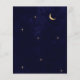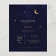 A minimalist modern celestial wedding invitation features a simple and elegant design. It includes a gold foil moon and stars that gently sparkle, set against a midnight blue background. The invitation uses classic serif typography, which adds a traditional and formal touch with its neat and clear style. The combination of modern design, shiny gold details, and timeless fonts makes the invitation both beautiful and inviting, perfect for announcing a special and elegant wedding day.