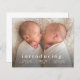 A Budget Minimal Twin Photo Birth Announcement featuring modern type and a large horizontal photo on the front. The back has 2 photos with a large name header and personal message from the family. Click the edit button to customize this design with your photos and details.